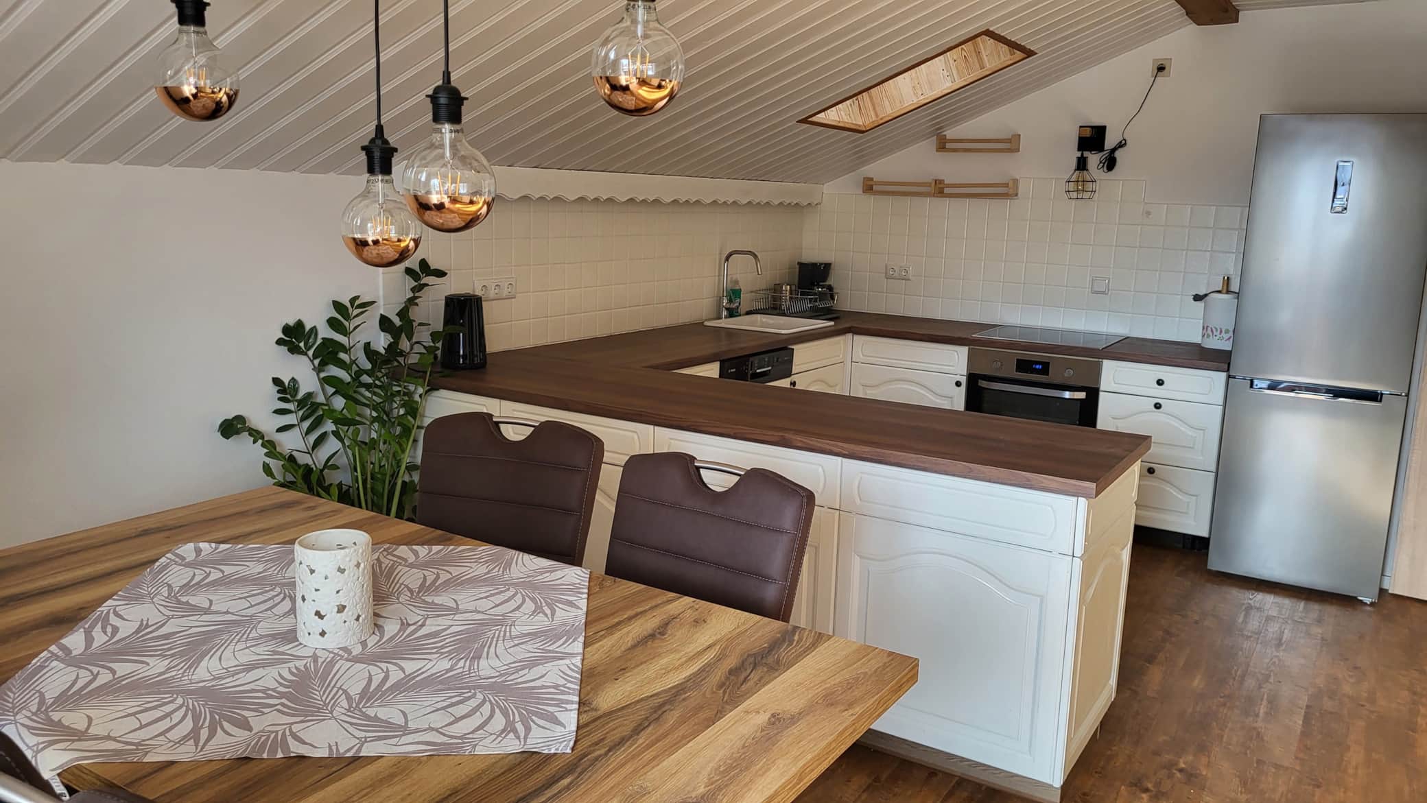 Unsere 85 m² große Ferienwohnung bietet ein gemütliches Schlafzimmer, eine voll ausgestattete Küche für kulinarische Entdeckungen, zwei großzügige Balkone mit Blick auf die malerische Umgebung.